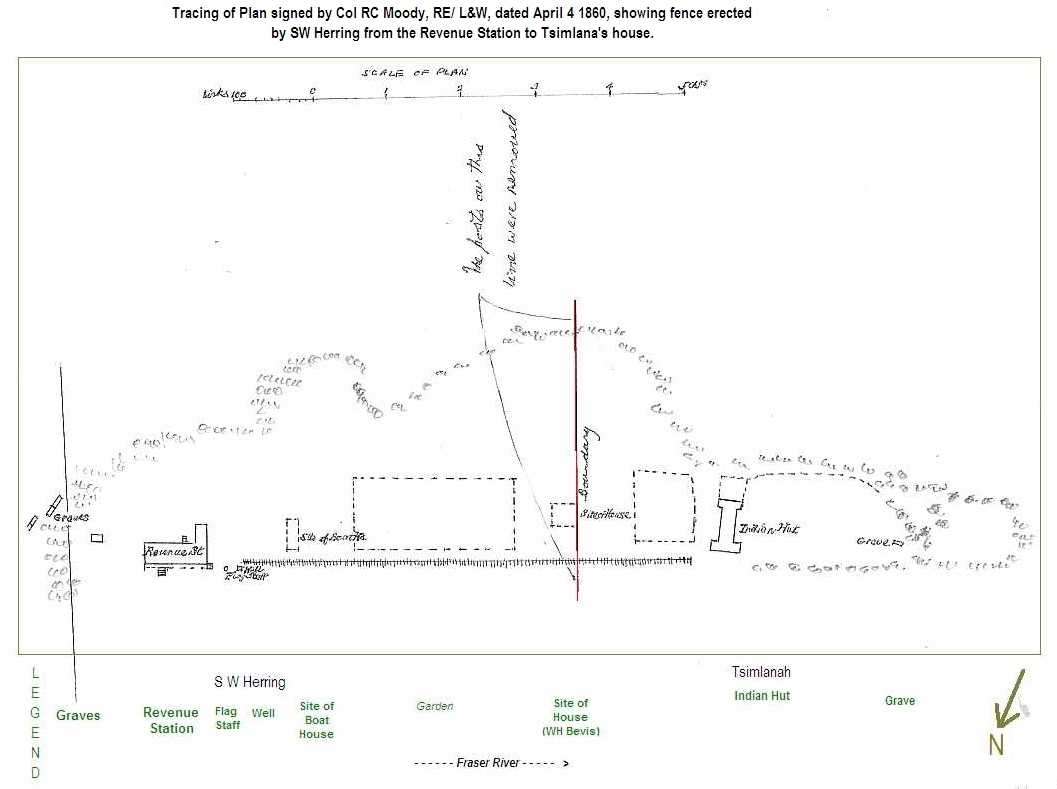 The location of the Revenue Station had benefits not solely strategic.   Prior to coming down to Queenborough, the Engineers and their families had been housed up at Derby, where there was cleared land,  and Colonel Moody had bought a cow to provide milk for his wife and children.  There was no pasture on the heavily forested hillside at Queenborough, but on the opposite side of the river, at the back of the outpost,  lay some fine natural grassland.   Moody soon had a “boat-house” erected at the Revenue Station.